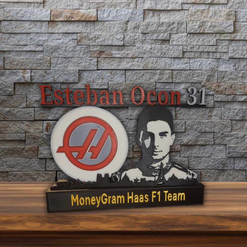 Ein aussergewöhnliches Sammlerstück für alle F1-Fans! Dieses Haas F1 3D-Druck Kunstwerk zeigt Fahrer Esteban Ocon (Nr. 31) mit Teamlogo und Skyline – perfekt umgesetzt im markanten Rot-Silber-Design des Teams.
